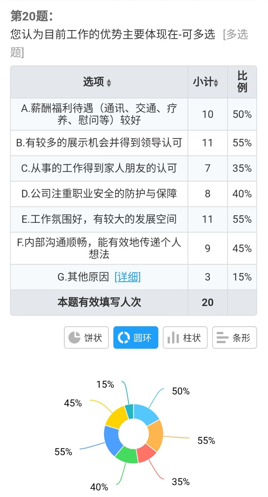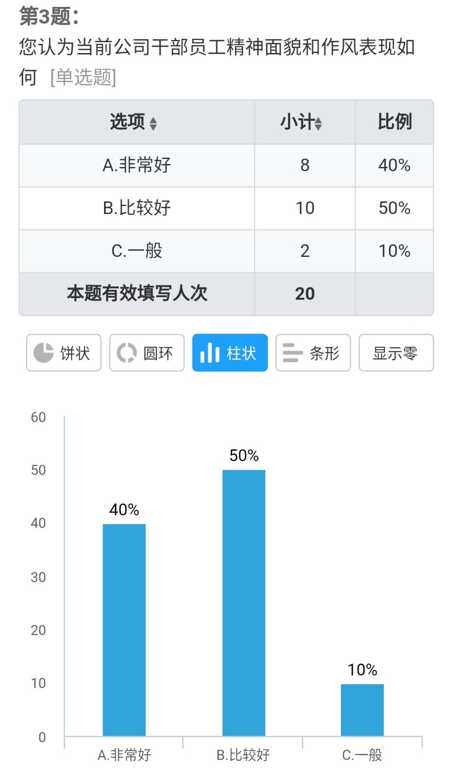 調研采用發(fā)放網(wǎng)絡問卷的方式,要求職工在線上進行填寫,共發(fā)放20份,收回20份,問卷內容涵蓋各科室、各年齡段以及不同性別,具有普遍性和代表性。通過網(wǎng)絡后臺統(tǒng)計匯總出的數(shù)據(jù),公司能夠比較全面且直觀地了解干部職工的思想狀況及其動態(tài)變化,包括對公司各項工作、對企業(yè)改革發(fā)展的真實想法以及對個人職業(yè)發(fā)展的規(guī)劃和在工作、生活等方面的迫切需求。