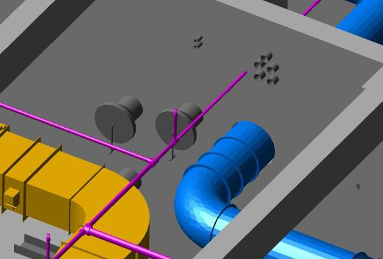 設備管道的綜合布置將所有管線通過BIM技術全部合成在一張圖上,找出復雜的交叉位置,發(fā)現(xiàn)各項專業(yè)在設計上存在的矛盾。根據(jù)各專業(yè)內部的排布規(guī)則,不同專業(yè)相互間的排布規(guī)則,以及與結構建筑的間距要求,維修空間等,具體規(guī)劃管線水平、垂直方向的分部。