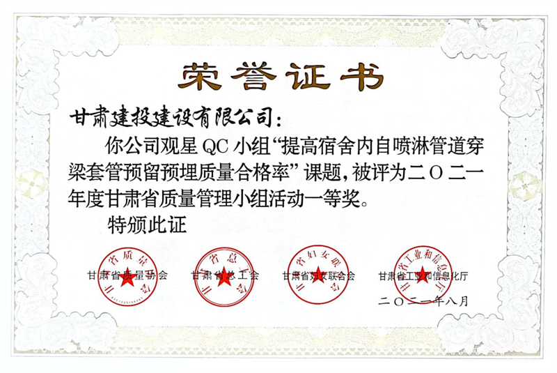 建設(shè)公司申報的36項QC成果中,1項成果獲全國“工程建設(shè)質(zhì)量管理小組二類成果,1項成果獲“甘肅省質(zhì)量管理小組活動最高榮譽獎——特等獎”、14項成果獲一等獎、19項成果獲得二等獎、2項成果獲得三等獎。建設(shè)公司榮獲“2021年度甘肅省質(zhì)量管理小組活動優(yōu)秀企業(yè)”稱號,這是繼2019年后,公司連續(xù)三年獲此殊榮。