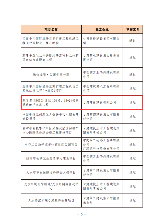 獲得“2021年甘肅省建設(shè)建設(shè)工程文明工地”的項(xiàng)目分別為:建設(shè)一公司承建的甘肅省軍糧庫綜合保障基地一期項(xiàng)目二標(biāo)段、百酈天香項(xiàng)目四標(biāo)段;建設(shè)三公司承建的象牙塔(EOID)B區(qū)10#樓、15-2#樓及周邊地下車庫工程、渭源縣城北環(huán)路東段棚戶區(qū)改造項(xiàng)目S2區(qū)5#-10#樓建設(shè)工程;建設(shè)四公司承建的定西市安定區(qū)關(guān)川中學(xué)建設(shè)項(xiàng)目;建設(shè)五公司承建的環(huán)縣北區(qū)公共租賃住房建設(shè)項(xiàng)目(一標(biāo)段);建設(shè)六公司承建的蘭州·桃李春風(fēng)康養(yǎng)小鎮(zhèn)(一期)項(xiàng)目、天水市麥積區(qū)上尚宅二期(一標(biāo)段);建設(shè)八公司承建的臨夏市肖家棚戶區(qū)改造安置小區(qū)C區(qū)建設(shè)項(xiàng)目施工二標(biāo)段;建設(shè)九公司承建的蘭州環(huán)球中心1#、6#、7#、8#、9#、10-2#樓、供熱站、小區(qū)大堂及二期地下室項(xiàng)目,天水市圖書館新館建設(shè)項(xiàng)目,天水市文化館新館建設(shè)項(xiàng)目。