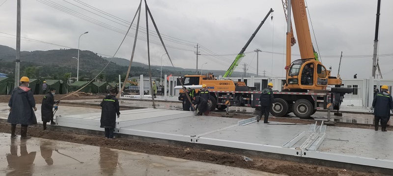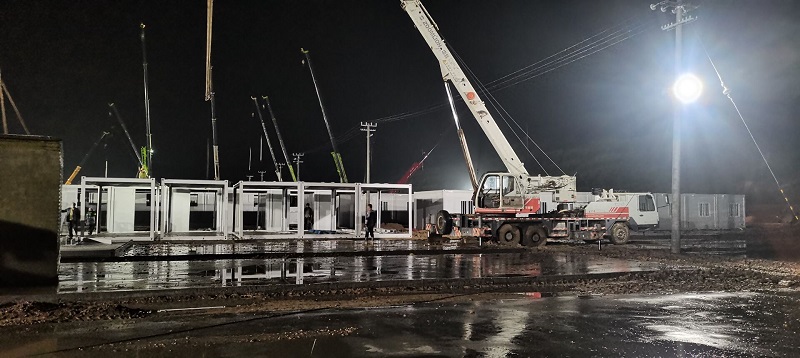 因疫情和連續(xù)降雨天氣,給施工造成一定困難,項目部全體人員風(fēng)雨里、泥濘中拼搏共進(jìn),分秒必爭,加快“逆行”腳步,顧不得休息,24小時不間斷輪班施工,全力以赴,統(tǒng)籌協(xié)調(diào)人力、物力、機械。截至目前已完成100間集裝箱的框架安裝和40套墻板安裝任務(wù),衛(wèi)浴設(shè)施及水電也在緊張施工過程中,剩余未完成工程量的材料已全部發(fā)貨,其他要素正逐項配齊。