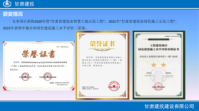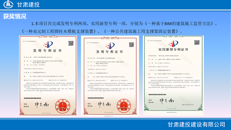 此前該項目還授權(quán)發(fā)明專利2項、實用新型專利1項,獲評省級工法1項,獲得省、市級文明工地、甘肅省建筑業(yè)智慧工地示范工程、甘肅省建筑業(yè)綠色施工示范工程、綠色建造施工水平評價二星級、首屆(2020)全國數(shù)字項目大獎賽二等獎等獎項。